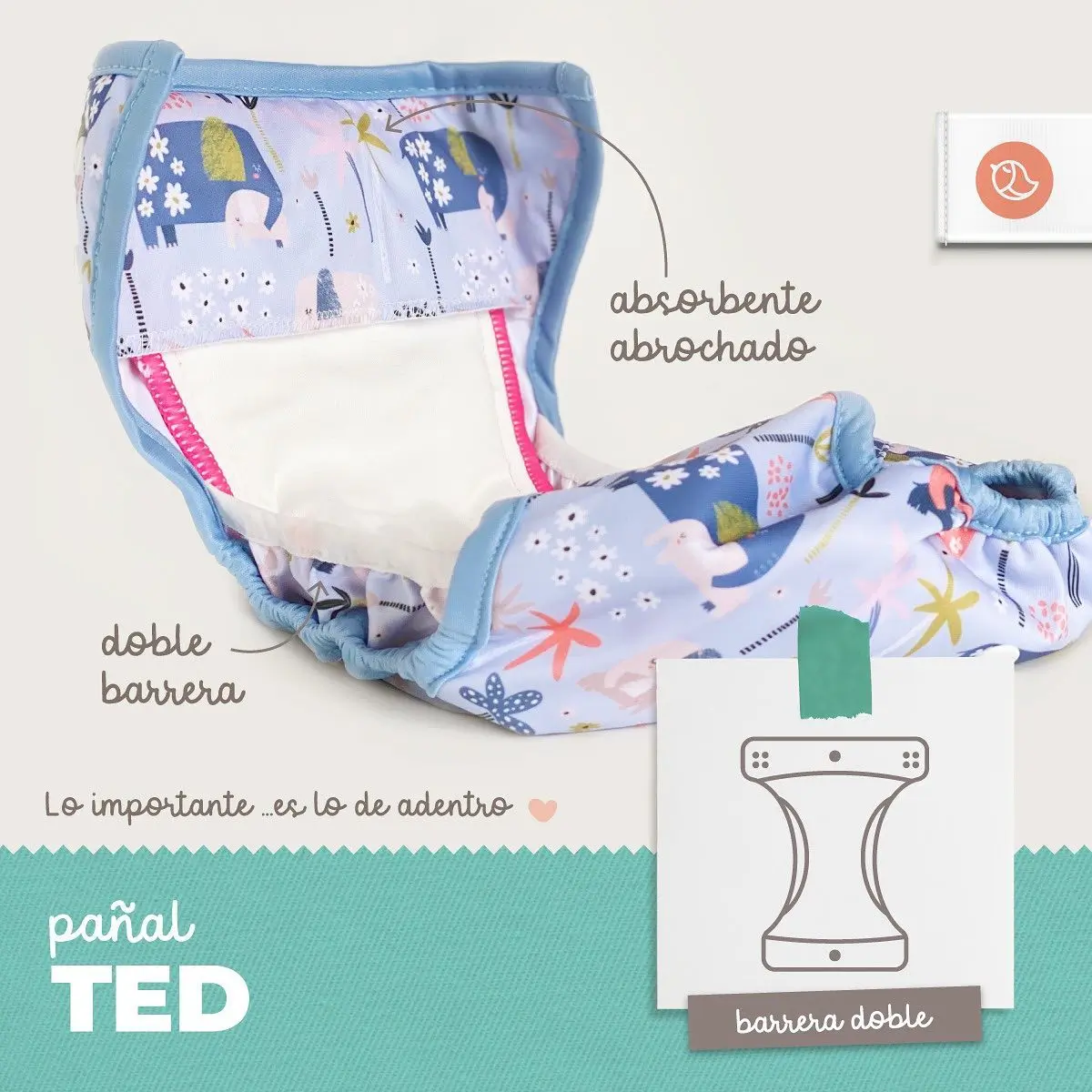 Sistema de Todo en Dos (TED): pañal de dos piezas (cobertor y absorbente). Se puede cambiar el absorbente y seguir usando el mismo cobertor.